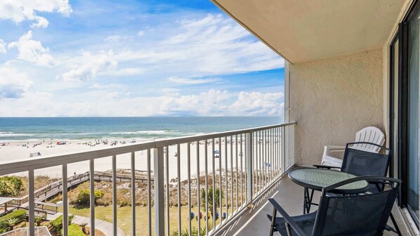Kick back in the bright and airy living space, decked out with comfy seating, a big-screen TV, and floor-to-ceiling windows that frame those killer ocean views. Slide open the doors and step onto your private balcony—the perfect perch for sipping your morning coffee while spotting dolphins or toasting the sunset with your favorite beachy cocktail.