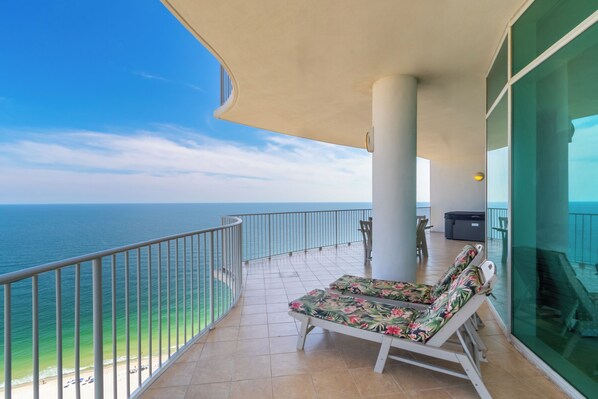 Terrace/patio - New pics 2026. EAST CORNER 4 bdr/4.5 bath. 27th floor. Sleeps 14. Gulf Front. (Orange Beach)