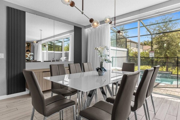 DETAILS • Central AC • Breakfast Bar • Washer & Dryer • Gated Community • Free Cable TV & WIFI • TV In Every Bedroom • Fully Equipped Kitchen • Stainless Steel Appliances • Washcloths are not provided • Fresh Towels & Linens provided • Family Room with Flat Screen TV • Hair Dryers, Iron & Ironing Board • Private Door Code for Each Guest Stay • Outdoor Patio Furniture with Sun Loungers • Pack 'n play/ High Chair (Free Upon Request) • Private Screened-in Pool + Child Safety Pool Fence
