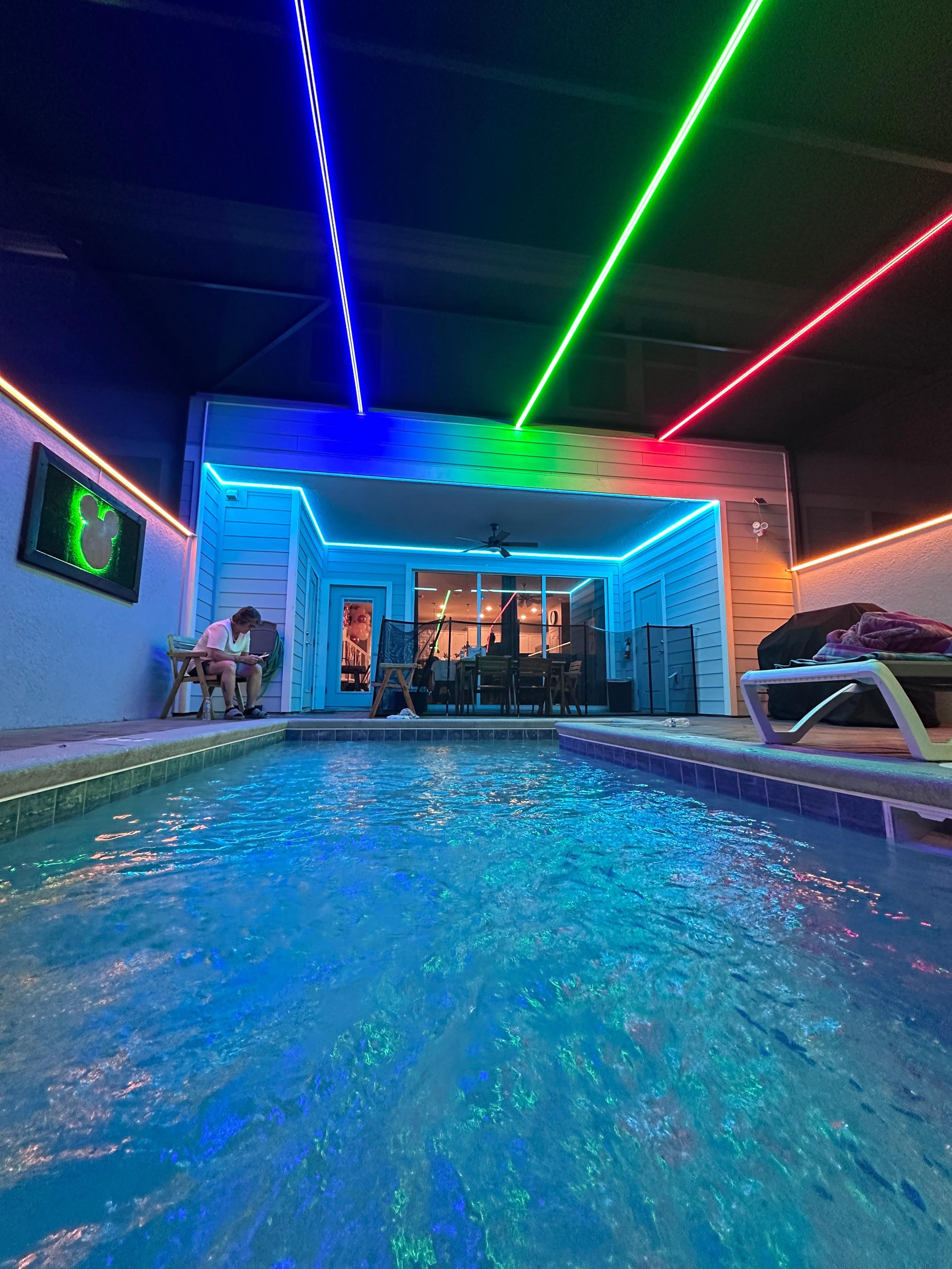 Additionally, there is a private game room equipped with 1 arcade, pool table, air hockey and a TV. The game room also includes a futon for additional guests. Each bedroom is adorned with a unique theme and Smart TV. The open-concept layout of the kitchen, living room, and dining room overlooks the pool and backyard, enhancing your enjoyment of quality moments with loved ones.
