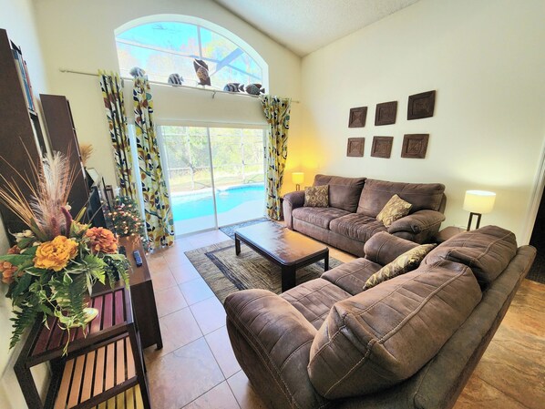 At the Beautiful & Spacious 4BR 3BA Pool Home in LAKE BERKLEY, bask in the Florida sun by your private pool and screened deck. This spacious home boasts two living areas, a fully equipped kitchen, washer and dryer for convenience. Enjoy WiFi throughout and unwind at the Community Pool or explore other resort amenities like Volleyball, Tennis or a Jogging/Walking Trail.