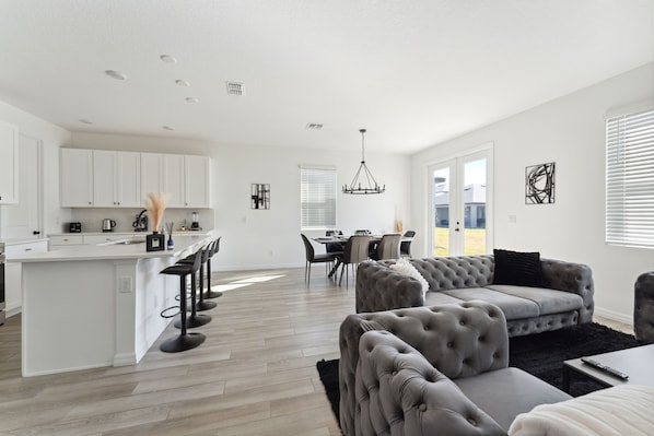 A separate dining area, and the living room's 70" 4K Smart TV with streaming services like Netflix, Disney+, and Hulu enabling cozy gatherings with the utmost comfort at your fingertips.