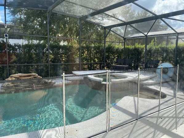 spacious four bedroom villa w/ pool and spa to kick back and relax on vacation take advantage of the close proximity to all disney attractions and only a ten minute drive to disney world! our newly renovated home has all the amenities you could think of! free internet access , private pool & spa, master suite , 3 full bathrooms on the second floor and one pool house bathroom with access from the pool. garage turned gameroom for the kids, full dining table for your dinners on vacation! the best is that you will feel at home when staying here that's what we strive to do is make our guests feel as if they were in their own home while on vacation! we have smart tvs in all rooms w/ remote we provide heated pool and hot tub for 65 a day and will need to know in advance if you will need the spa and pool to be heated upon arrival the pool takes appx 24 hours to heat and hot tub can be heated within a few hours. if you have any questions please feel free to ask