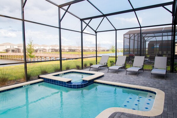 This comfortable, private villa accommodates up to 23 guests with 9 bedrooms and 5 full bathrooms. Located at the newest and one of the most requested resorts in Kissimmee, Florida, the Storey Lake Resort. Luxuriously decorated, its design incorporates modern and contemporary chic aspects. With it's own game room, two living room areas, private pool and a BBQ. The master bedroom, located on the first floor, has a private bathroom with a tub, separate shower, and his and her sinks. The covered lanai and heated pool & spa offer the best outdoor vacation experience. Everything you need in a vacation home to create amazing memories can be found in this fantastic house!