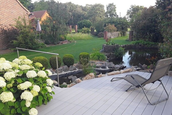 We warmly welcome you to the beautiful Münsterland! in Ostbevern (Brock district) Our holiday apartment "Aufderhaar" offers the perfect environment to relax with a large garden with several terraces and a garden house with its own garden pond. The 120 m² non-smoking holiday apartment offers 3 bedrooms (2 with box spring beds), 2 bathrooms, as well as a fully equipped kitchen and a large living room with a view of the garden house and the pond on 2 floors. WiFi (fiber optic connection) and a charcoal grill are also included. The holiday apartment has its own entrance. Parking options for bicycles in the garage directly at the house We ask for your understanding that we do not accept dogs, cats or other pets in our house.