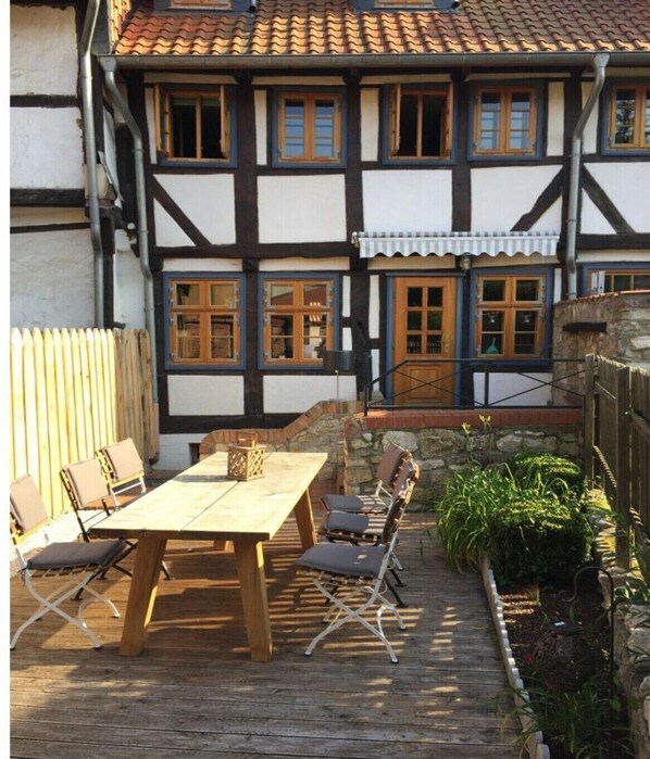 The old Schusterhaus is located in the historic old town center of the city of Osterwieck. Up to 6 people can be accommodated in our holiday home. Layout: Ground floor: (Living room(TV, stove, radio, stereo unit), Kitchen(dining table, stove, hob, electric kettle, toaster, coffee machine, oven, microwave, dishwasher, fridge, freezer, Food processor), bedroom(double bed, TV, radio), bedroom(double bed, TV, radio), bedroom(single bed, TV, radio), bedroom(single bed, TV, radio), bathroom(shower, washbasin, toilet, Towels incl.), bathroom(shower, washbasin, toilet, Towels incl.), bathroom(washbasin, toilet, Towels incl.), storage(tumble dryer, washing machine, ironing board, iron, drying cabinet), storage)