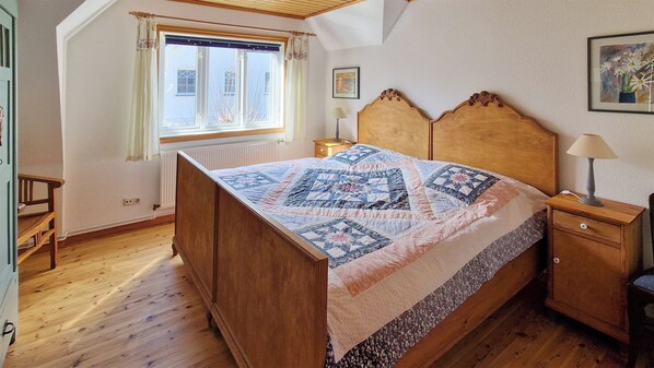 In the 1st There are two bedrooms upstairs: The first bedroom has a double bed (180 x 200 cm), in the children's room there is a double bed (140 x 200 cm), a single bed (90 x 200 cm) and a wooden cot (70 x 140 cm) , The furniture in both rooms is also partly antique. Please note our pictures!