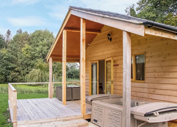 There are two bedrooms here, including a double and twin bedded, which both feature their own en suite shower rooms so there’s no queuing in the morning! Step out onto the decking and discover the private hot tub, perfect for a relaxing soak after a day of rambling the Shropshire countryside, whilst the kids make the most of the surrounding lawned garden, and there is also a pretty lake on-site where you can feed the ducks too.
