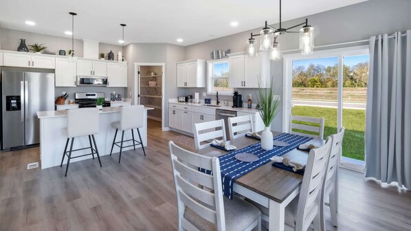 Welcome to Nestled AwayThe Harbor Village Neighborhood • Heritage Harbor Marina Resort • Managed by Harbor Inn Vacation RentalsModern comfort meets resort living in this spacious single-level retreat, perfect for families or couples looking for a relaxing getaway. Whether you're sharing meals around the oversized kitchen island, cozying up by the fireplace, or enjoying nearby resort amenities, Nestled Away is designed to help you feel right at home.Home Features:This 1,549 sq. ft. ranch home features 3 bedrooms, 2 bathrooms, and comfortably sleeps up to 6 guests. The open-concept layout, thoughtful design, and dog-friendly policy make it a versatile option for everything from family vacations to couple getaways.Main Level Living:Step into a bright and welcoming space filled with modern finishes and plenty of room to gather.Kitchen & Dining: Stainless steel appliances, abundant cabinet space, a walk-in pantry, and a large kitchen island with three stools—perfect for breakfast or casual conversations. The dining table seats 6 comfortably.Living Room: Cozy seating, a flat-screen TV, and an electric fireplace make this the perfect spot to unwind after a day of adventure.Bedrooms:Primary Bedroom: King-size bed, ensuite bathroom with double sinks, walk-in shower, and walk-in closet.Second Bedroom: Queen-size bed with closet and flat-screen TV.Third Bedroom: Two twin beds with closet and flat-screen TV.Bathrooms: In addition to the ensuite, the second full bathroom includes a shower/tub combo for added convenience.Parking:This home includes a two-car garage for secure and convenient parking.Perks & Amenities:✔ 3 bedrooms | 2 bathrooms✔ Spacious open-concept living✔ Stainless steel appliances + walk-in pantry✔ Electric fireplace in living room✔ Two-car garage✔ Heated resort pool nearby✔ Marina access with rentals (pontoons, bikes, and more!)✔ Walking paths, fire pits, and pickleball courts✔ Onsite dining and live entertainment✔ Minutes from Starved Rock State Park and downtown OttawaInteraction with Guests:We’re here to make sure your stay is comfortable and memorable. Reach out anytime between 9 a.m. and 5 p.m. with questions, recommendations, or assistance. We’re local, we love this area, and we’ll gladly share our favorite spots to eat, hike, and explore.House Rules:Please help us maintain a peaceful and enjoyable environment:Quiet Hours: 10 p.m. – 7 a.m.No parties, events, or tentsSmoking is not allowed anywhere on the propertyPet Policy:We love fur babies—but we have to keep it simple here:One dog max50lb weight limit$100 non-refundable pet feeLeashed when outside and crated if unattendedIgnoring the pet policy may result in a $300 fineSteps Away from the Action:Enjoy easy access to all the fun Heritage Harbor has to offer:Pontoon, kayak, and bike rentalsOnsite waterfront restaurantThe Oasis outdoor venue for live music and drinksPickleball courts, sand volleyball, and scenic walking trailsNestled Away is professionally managed by Harbor Inn Vacation Rentals, your local team at Heritage Harbor dedicated to making your stay unforgettable.