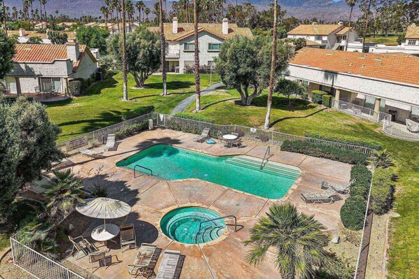 Does Near Coachella Desert Falls Home | Steps to Pool, Spa, & Family Fun! | Golf Course & Mountain Views have a pool?