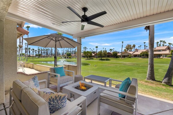 Private Covered Patio: Step out and feel the desert breeze on the 8th-hole fairway. Enjoy sun-drenched afternoons or gather for al fresco dinners with family and friends. As the sun sets, unwind by the firepit with a glass of wine, all while soaking in breathtaking views of the golf course and majestic San Jacinto mountains.
