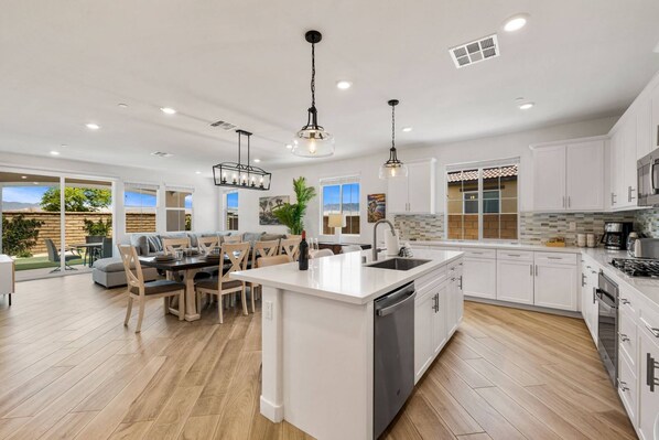 This property is a brand new construction, thoughtfully furnished to provide an exceptional Palm Desert experience. The living room, kitchen, and dining area are seamlessly connected, creating a perfect space for quality time with friends or family. Unwind on the spacious sectional, and indulge in your favorite sporting events or shows on the 65in. SmartTV. The well-stocked kitchen is a chef's dream, and the dining table, with its eight seats, is conveniently located for easy access to meals.