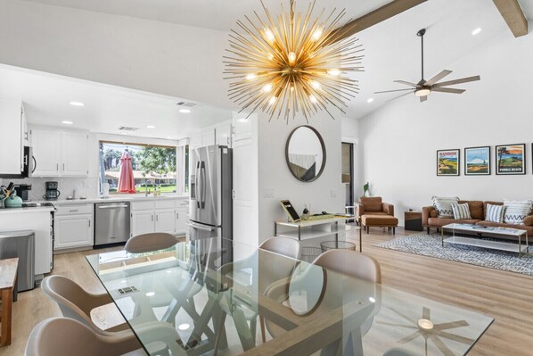 The home includes the following amenities to accommodate the max number (8) of guests: dining, cooking and serving essentials including plates, bowls, flatware, wine and drinking glasses, mugs, cooking utensils, pots/pans, and kitchen accessories such as can opener, wine opener, measuring spoons bar tools, grill tools, and more. Basic spices, salt and pepper, olive oil provided.
