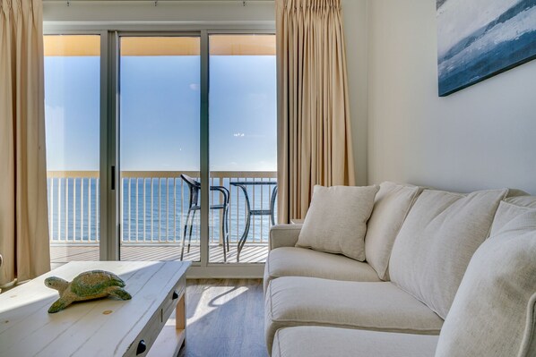 This property is beautiful inside and out. It is a wonderful size for a small or large group. It is extremely clean, taken care, and newly remodeled. The view is gorgeous with full view of the ocean, the dolphins and the white sand beach. This condo has a nice location, everything you need is in walking distance. We had a great time in Panama City Beach and were thankful to be able to stay at this condo.