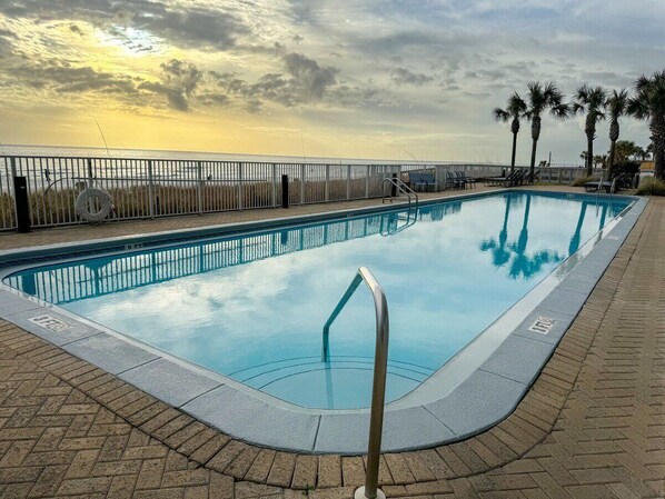 Oceanfront condo with scenic balcony, resort amenities, central AC, & W/D