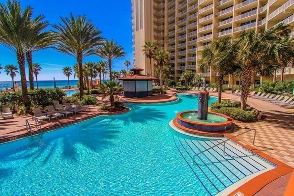 Outside your door, indulge in resort-style amenities including the lagoon-style beachfront pool, seasonal tiki bar, hot tub, indoor pool, and direct beach access, fitness area and more!
