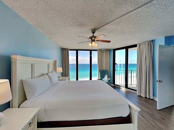 Inside Edgewater Tower 3 1204, you'll find an elegantly appointed master bedroom (located on the first level), with large flat screen TV, private balcony access, and private full bath. There is also a second bedroom on the upper level which houses a queen bed, a large flat screen TV, and has private bathroom access.