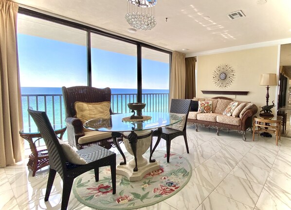 The Penthouse spans 3,000 square feet and with an expansive living room overlooking the Gulf of Mexico's brilliant blue-green water. You will be captivated with the MILLION DOLLAR view of the Gulf with floor to ceiling windows throughout the condo and the Gulf front Balcony. Perfect backdrop for a magical Family Beach vacation! You will also enjoy breathtaking views from the kitchen, dining room, and the primary bedroom! The dining area seats 6 and offers unparalleled sunrise and sunset views. The kitchen comes fully equipped including double ovens and a breakfast bar that seats four.