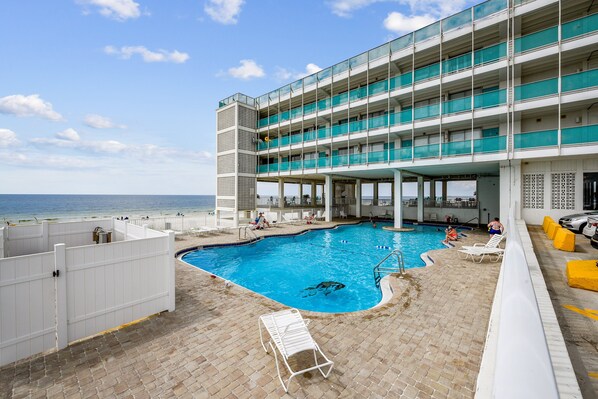 This astounding Gulf-front getaway is meticulously renovated with purpose and style. This unit has LVP flooring, crown molding, mirrored walls, and a queen bed plus a sleep sofa so you can sleep 4 guests. Fountainebleau Terrace boasts a large on-site pool & parking, BBQ/Grilling area, large beachfront deck, and of course, amazing views of the Gulf of Mexico. In the perfect central location, this property is less than a mile to Gulf World, two miles to Pier Park and 4 miles to Wonderworks, Ripley's Believe It or Not, and Zoo World! Book your dream stay today!