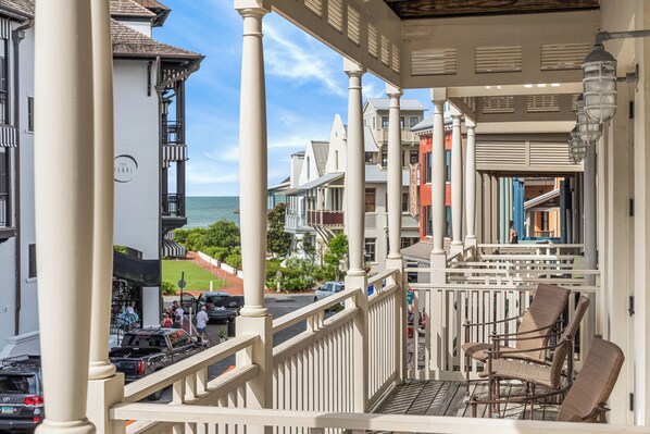 Step into the open-concept living space where the kitchen seamlessly flows into the living area, creating a bright and welcoming environment. The fully-equipped kitchen features modern appliances and everything you need to prepare delicious meals. The adjoining living room is a cozy spot to relax, complete with comfortable seating and large windows that fill the space with natural light. Step out onto the balcony, where you can enjoy the fresh sea breeze and take in the lively atmosphere of Rosemary Beach below.