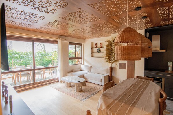This sumptuous three-room accommodation, nestled in lush greenery on the outskirts of Paris, 15 minutes from the Eiffel Tower, offers you an exceptional experience combining bohemian chic charm with a soothing oriental ambiance.