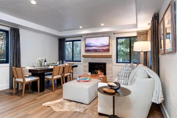 Living room: The main-level living room is a cozy haven, featuring a modern gas fireplace that serves as the room's inviting focal point. Expansive corner windows frame views of the snow-covered landscape, and the plush chairs and sofa create an ideal spot to unwind with a good book. A Frame Smart TV offers easy entertainment with your favorite shows and movies, and when it's not in use, it transforms into a warm, mountain-themed art display.