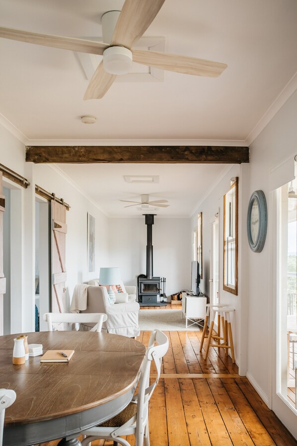 It has a cast iron wood fireplace and firewood supplied for the cooler months, and ceiling fans for the warmer months. There is also an outdoors fire pit for the winters and a bbq on the balcony overlooking the river, if you would rather a casual meal rather than using the newly renovated kitchen.