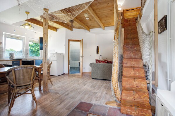 Located in Peenemünde, the holiday apartment Landhaus Peenemnde has everything you need for a relaxing holiday. The 2-storey property consists of a living room with a sofa bed for 2 people, a kitchen, 1 bedroom and 1 bathroom and can therefore accommodate 4 people. Additional amenities include Wi-Fi as well as a TV. This accommodation does not provide towels or bed linens; guests are required to bring their own. This property boasts a private outdoor area featuring a garden, open terrace, and barbecue.