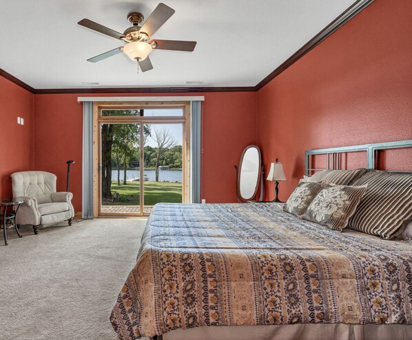 The master bedroom on the ground floor offers luxury with a king-size bed, walk-in closet, private walkout, and an en suite bathroom equipped with a six-foot soaking tub. The second floor houses four expansive bedrooms, two of which include an additional bed each. A snug loft area provides a scenic overlook of the kitchen and lake views, ideal for reading, board games, or movie nights. The property also includes a sizable laundry room with dual front-loading washers and dryers, next to a three-car heated garage.