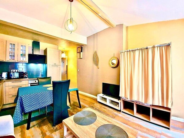 Where is The COCOONING Charm and comfort in a bright studio apartment located?