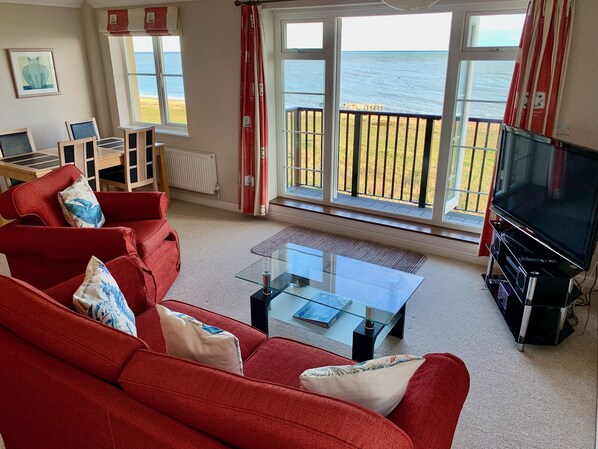 The living space of this second floor apartment is open plan and contemporary in design. The well equipped kitchen includes a gas hob, oven, fridge-freezer, dishwasher, microwave and washing machine/tumble dryer. A dining area seats up to six and the lounge area is positioned by the French doors that open to the balcony - with those all-important sea views!