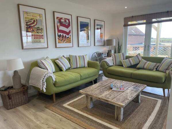 Patio doors lead to the front decked area, a haven for relaxation with two sun loungers, a bespoke table & chairs that transform into an outdoor bed, and a built-in electric BBQ. It's the perfect spot to watch the sun setting over the fields beyond.