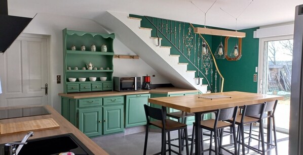 The gîte offers all the comfort needed for up to 8 guests. On the ground floor, you'll find a fully equipped kitchen of about 25 m², open to a living area of around 38 m². Upstairs, there are three bedrooms and a bathroom. All beds have duvets, pillows, and bed linen, and will be made up for your arrival. A private garage is at your disposal. Outside, enjoy a plancha grill, ping-pong table, wooden terrace, and garden furniture.