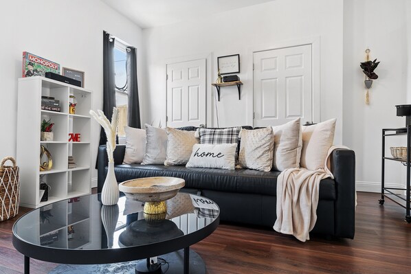Modern 2B/1Bath Apartment with modern chic style. Amazing central location just a short distance to all attractions Philly has to offer. 5 minutes from Temple U. 15 minutes from Center City Home theater experience with complimentary snacks. Clean and crisp rooms that are bright and spacious. Amenities include smart TV, Wifi, projector, games, water, snacks, Netflix, Youtube Lots of areas for pictures to post! You'll love the keyless entry that will help you during the duration of your stay