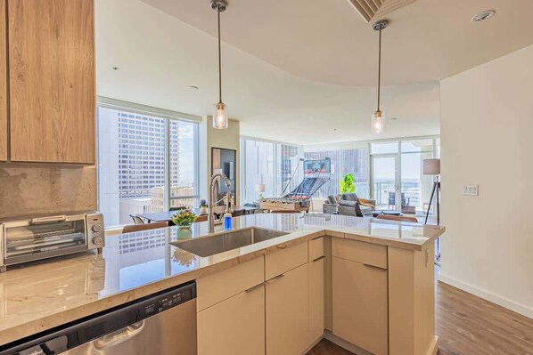 Guest Access: ✔ High-Speed Fiber Wi-Fi ✔ Gym ✔ Pool & Hot tub ✔ Game room w/ pool tables ✔10-in-1 Combo Game Table - Hockey, Foosball, Pool, Shuffleboard, Ping Pong, Chess, Card, Checkers, Bowling, and Backgammon ✔ Golf Simulator ✔ Dog Wash Station ✔ Coffee Bar ✔ Office Desk and Chair ✔ Centralized AC/Heating ✔ Washer/Dryer In Unit ✔ Fitness Center ✔ Self check in and out ✔ Instant communication and friendly support from our team ✔ Kitchenware and silverware you can use to cook your favorite meals during your stay are readily available.