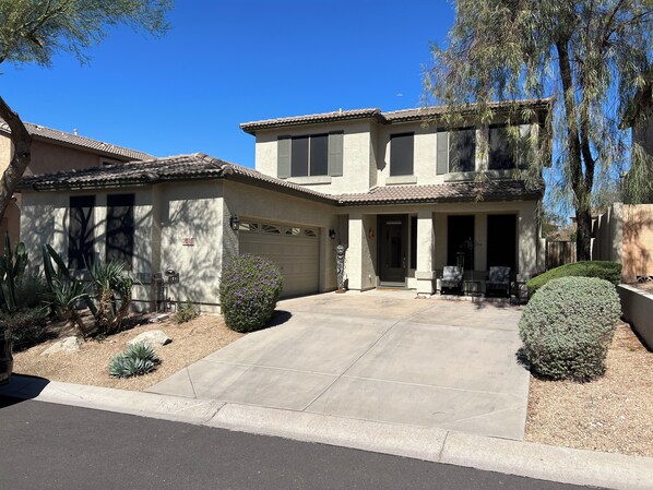 Discover the beauty of Mesa from this welcoming 3-bedroom house. This amazing property features a king bed, queen bed, and full bed, perfect for a tranquil night's sleep. With 3 bathrooms and a cozy office space with a sofa bed, guests will feel right at home. Original Art, games, comfort, and cozy surroundings for every member of your familly and friends! We'll be available to answer any questions while you stay at our place. Golf course just a few minutes away, PickleBall court, community center, hiking, one of the small community swimming pool is around the corner, you can see it from the patio! Biking trails and bikes included with this wonderful home! High desert beauty, city lights at night in the distance, clear deserst skies at night! Gated communitiy, private and tranquile......Join us!
