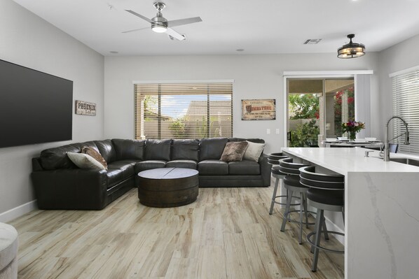 Our HOME was remodeled in RESTORATION HARDWARE LIKE DECOR with ALL NEW modern furnishings and has a very light and open floor plan with Gorgeous imported quartz counter tops throughout with a waterfall center island in the kitchen. There is all new extra large wood plank porcelain tile throughout(no Carpet)