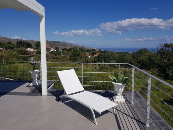 From the ground floor, step through the large sliding glass doors to enjoy the spacious main terrace with its spectacular views of Mount Etna and Taormina. The well-kept garden next to the terrace will make your stay even more charming. There is also a barbecue.