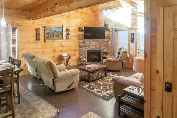 Step inside to find a warm and inviting living room, thoughtfully designed for relaxation and entertainment. Unwind by the stone fireplace with your favorite movie streaming on Netflix, or challenge your crew to a lively game of pool in the game area. The open-concept layout keeps everyone connected, whether you're curling up with a good book or sharing laughs over a board game.