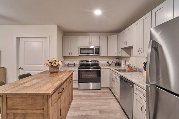 ★KITCHEN★ Enjoy the flexibility of preparing your own meals in the well-appointed kitchen. Well-appointed with a full-sized refrigerator, dishwasher, stove, microwave, and other kitchen appliances perfect for making breakfast, lunch, or dinner throughout your stay! All pots, pans, glasses, plates, silverware, etc., are also there for you! Gather around the inviting dining table to share stories and laughter, as it invites you to savor each bite.