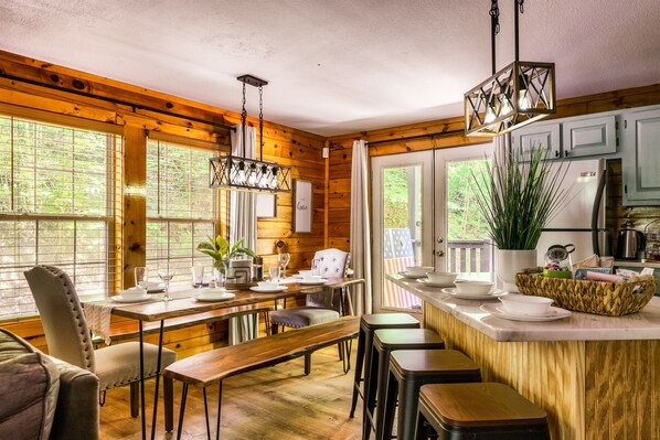 Cooking up tasty group meals is a breeze thanks to the cabin's fully equipped kitchen. You'll find all the basic cooking necessities, including pots, pans, spices, and more. Modern appliances like the stove, oven, microwave, dishwasher, toaster, and two refrigerators make channeling your inner chef a piece of cake.