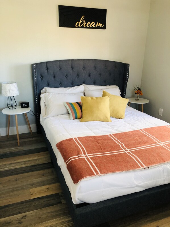 This is a completely remodeled historic cottage and is a quaint relaxing space, with a massive front porch. The main house is approx. 500 square feet, with approx. a 200 square foot casita. There is one bedroom in the main house (with a queen bed), one sleeper sofa couch in the family room, and one queen bed in a separate casita. The casita is a great mini sanctuary space, but it does not have a bathroom. You will need to take a short walk into the main house to access the bathroom. Kitchen has all the basics you’ll need for cooking along with an outside grill, with a small local grocery store available in town.