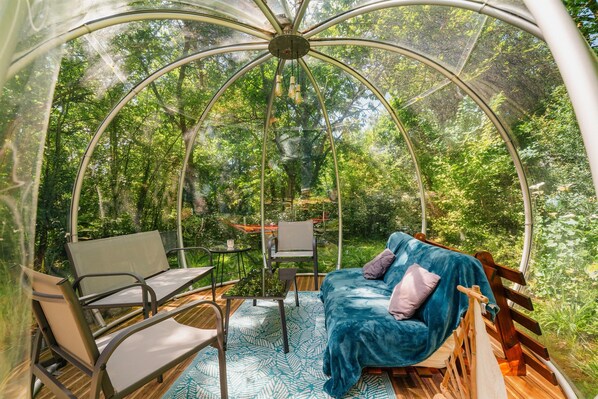 Fully-equipped wooden terrace to enjoy the wooded surroundings.