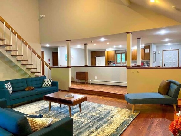 • Living Room: a bright spacious room with a wood burning fireplace, featuring two-stories high vaulted ceiling, glass doors coming out on to the large outdoor deck, two comfortable sofas, two accent chars, two chaise lounges, and a 65-inch TV.