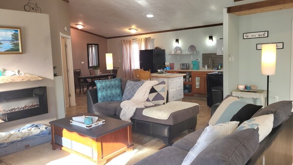Our spacious living room invites you to relax on the sectional and enjoy a movie, or your favorite program, on the 65" smart tv.