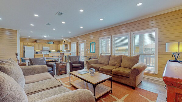 Enjoy preparing meals in a kitchen with all the modern conveniences and room for the whole family. There is bar seating for four, and a dining table with seating for 10. Relax after your day at the beach in a spacious family area with plenty of comfortable seating, satellite TV, and a DVD/Blue Ray player, as well as high speed internet for your convenience.