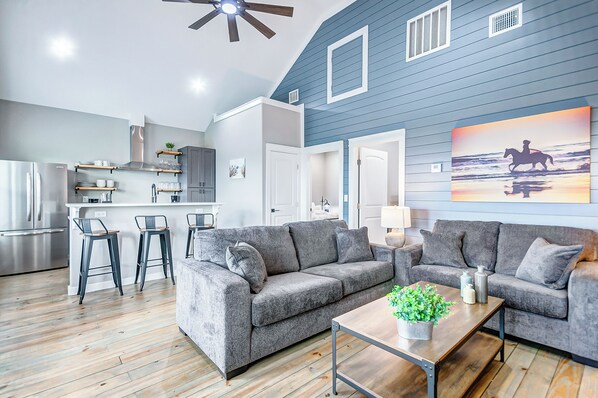 At The Villas at Rollover Bay, this newly built home offers a relaxing retreat with glorious sunrise and sunset views from the deck. Enjoy meal prepping in the open kitchen, streaming your favorite shows on Smart TVs, and grilling up something tasty on the charcoal pit downstairs. Take advantage of 2 free passes to Margaritaville's heated swim-up bar/pool or unwind at the neighborhood pool area.