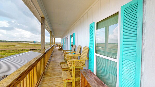 This canal-side home sits on the bay side of the peninsula, and has views of water all around. You'll enjoy the marsh views from the high backed chairs on the upper deck.