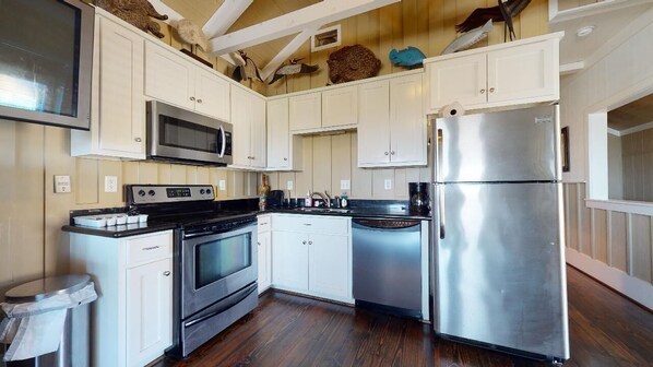 Enjoy beautiful water views from anywhere on the decks. Bring your catch home, and you can cook it on the charcoal grill and serve it on the picnic table outdoors, or prepare it in the stocked kitchen and eat indoors at the dining table.