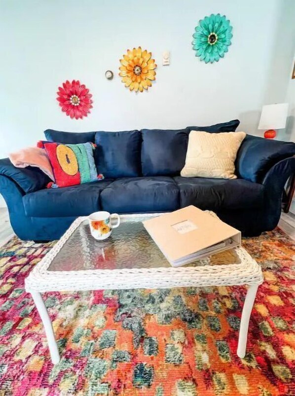 You will enter through the backyard, outfitted with a hot tub, fire pit, grill, and outdoor dining table set. The backdoor of the home opens to a foyer, where behind the folding doors you will find a washer and dryer (along with detergent/dryer sheets). The smaller bedroom is to your left, along with a cubby holding your beach towels. The bathroom will be ahead to your right, the large shower includes shampoo, conditioner and body wash, and a blow dryer is hiding under the sink. The main bedroom is right outside the bath. Both bedrooms are colorfully decorated, with new queen beds, a closet and luggage rack. The kitchen/living room is open concept. There is dining seating for 4, and the basics you will need are supplied including coffee and tea, basic spices. The Keurig will brew either a single cup, or an entire pot for your group. A blender, toaster, cookie sheet and cake pan are provided. The 42” Roku HDTV is set up to stream your favorite entertainment.
